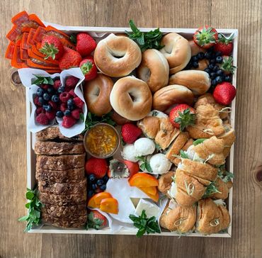 fresh fruit, mini yogurt parfaits, sweet breakfast quick bread (blueberry, lemon poppy seed or cinnamon streusel), bagels, mini croissant sandwiches, honey, orange marmalade, small brie wheel.