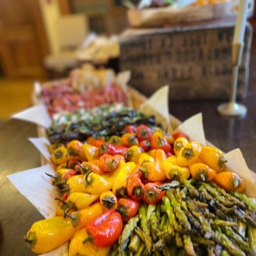 assortment of roasted baby vegetables, hummus & tapenade served with our housemade grilled flatbread, 2 dozen red pepper and walnut tarts, 2 dozen savory apple & onion pinwheels (made with vegan feta)